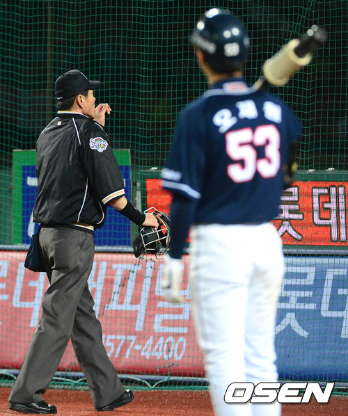 12일 오후 부산 사직구장에서 열린 2012 팔도 프로야구 준플레이오프 4차전 두산 베어스와 롯데 자이언츠의 경기, 7회초 2사 두산 김재호 타석때 최규순 구심이 경기 방해 관중에 대해 주의를 주고 있다.