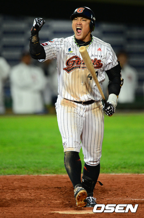 12일 오후 부산 사직구장에서 열린 2012 팔도 프로야구 준플레이오프 4차전 두산 베어스와 롯데 자이언츠의 경기, 8회말 1사 1,2루에서 롯데 홍성흔이 볼넷으로 출루하며 기뻐하고 있다.