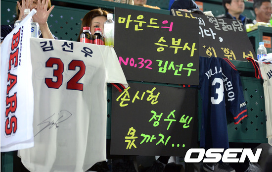 12일 오후 부산 사직구장에서 열린 2012 팔도 프로야구 준플레이오프 4차전 두산 베어스와 롯데 자이언츠의 경기, 두산 베어스 팬들이 객석에서 플랜카드로 두산 베어스를 응원하고 있다.