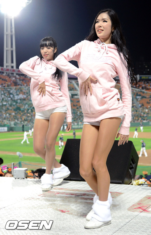 12일 오후 부산 사직구장에서 열린 2012 팔도 프로야구 준플레이오프 4차전 두산 베어스와 롯데 자이언츠의 경기, 롯데 치어리더들이 힘찬 무대를 선보이고 있다.
