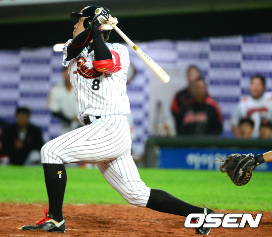 12일 오후 부산 사직구장에서 열린 2012 팔도 프로야구 준플레이오프 4차전 두산 베어스와 롯데 자이언츠의 경기, 8회말 1사 만루 롯데 전준우가 희생플라이를 치고 있다.