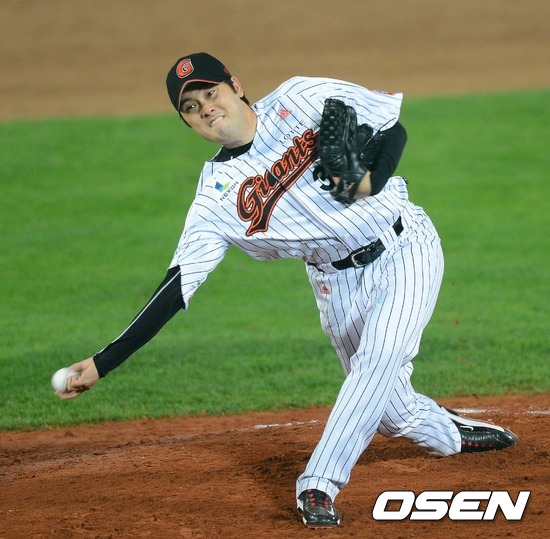 12일 오후 부산 사직구장에서 열린 2012 팔도프로야구 준플레이오프 4차전 두산 베어스와 롯데 자이언츠 경기, 9회초 롯데 정대현이 등판 공을 뿌리고 있다.