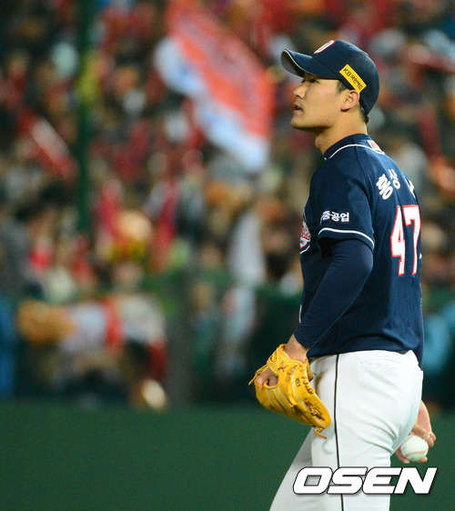 12일 오후 부산 사직구장에서 열린 2012 팔도 프로야구 준플레이오프 4차전 두산 베어스와 롯데 자이언츠의 경기, 8회말 1사 만루 롯데 전준우의 희생플라이로 동점을 허용한 두산 홍상삼이 아쉬워하고 있다.