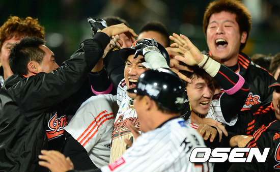 12일 오후 부산 사직구장에서 열린 2012 팔도 프로야구 준플레이오프 4차전 두산 베어스와 롯데 자이언츠의 경기, 연장 10회말 1사 2루 롯데 홍성흔 타석에 두산 프록터의 폭투가 나오자 양의지가 황급히 3루로 송구하였지만 볼이 뒤로 빠지며 2루주자 박준서가 홈을 밟으며 경기를 마감하고 있다. 경기후 롯데 선수들이 열광하고 있다. /jpnews@osen.co.kr