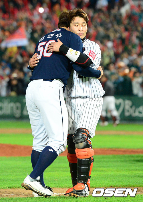 경기 종료 후 두산 김현수와 롯데 용덕한이 포옹을 하고 있다. /sunday@osen.co.kr