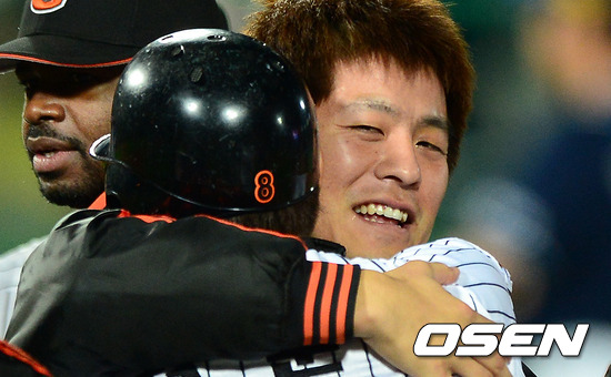 롯데 강민호가 전준우와 포옹을 하며 승리를 만끽하고 있다./jpnews@osen.co.kr