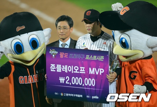 준플레이오프 MVP에 오른 정대현이 시상식에서 포즈를 취하고 있다./ ajyoung@osen.co.kr