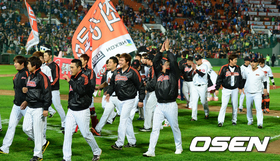 롯데 선수들이 승리를 기뻐하며 팬들에게 인사를 하고 있다./jpnews@osen.co.kr