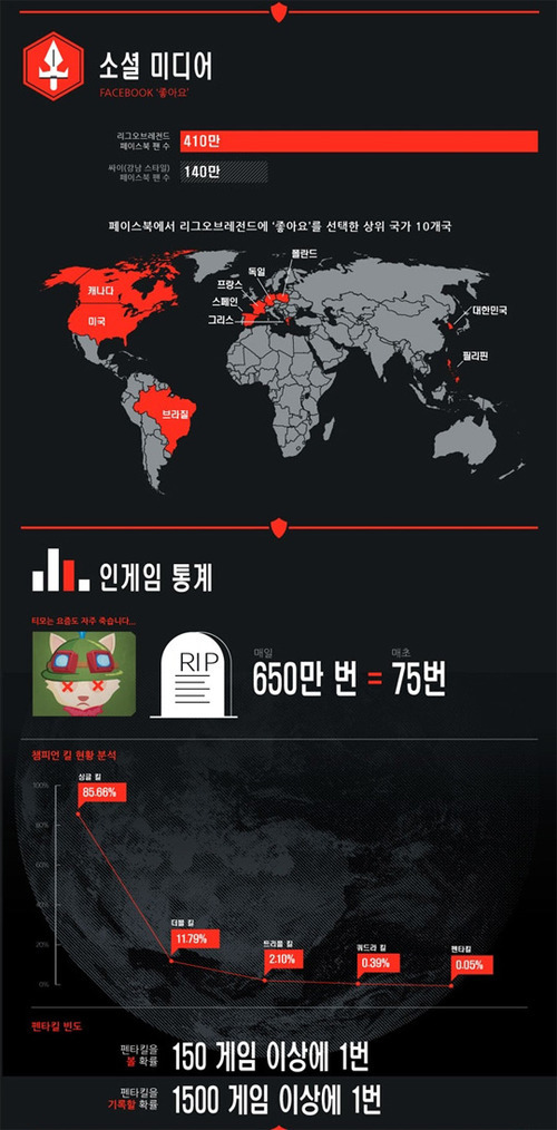 인포그래픽에는 LoL 페이스북의 팬 수(410만 명) 및 게임 내에서 ‘펜타킬(5명의 상대를 연속으로 잡는 것)’을 접하거나 기록할 수 빈도 등 재미있는 수치들도 함께 공개됐다.