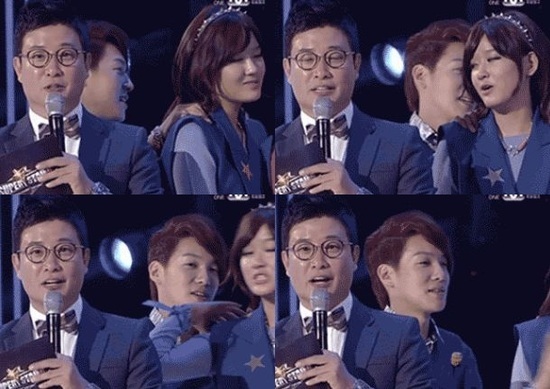 이는 김성주가 탈락자 발표 후 클로징 멘트를 하는 사이 그 뒤에서 두 번째 생방송 무대 진출자와 탈락자들이 인사하는 동안 이지혜와 김태현의 모습이 카메라에 잡힌 것.