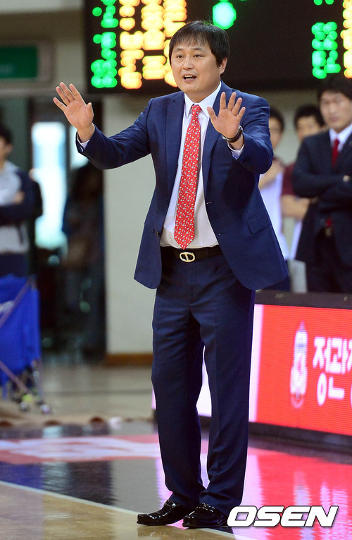 13일 오후 안양 실내체육관에서 열린 '2012-2013 KB국민카드 프로농구' 안양 인삼공사와 원주 동부의 경기 1쿼터 이상범 감독이 선수들에게 지시를 하고 있다.