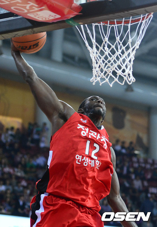 13일 오후 안양 실내체육관에서 열린 '2012-2013 KB국민카드 프로농구' 안양 인삼공사와 원주 동부의 경기 1쿼터 인삼공사 파틸로가 덩크슛을 하고 있다.