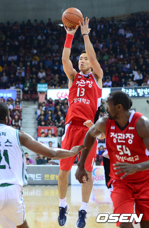 13일 오후 안양 실내체육관에서 열린 '2012-2013 KB국민카드 프로농구' 안양 인삼공사와 원주 동부의 경기 2쿼터 인삼공사 김성철이 외곽슛을 시도하고 있다.