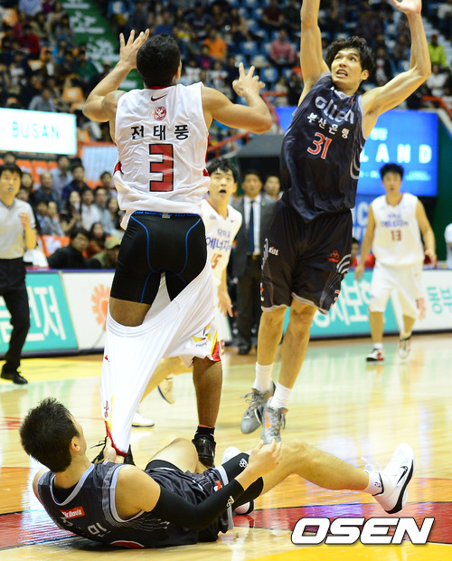 4쿼터 오리온스 전태풍이 볼다툼 과정에서 KT 조성민에 바지를 잡혀 바지가 벗겨지고 있다.