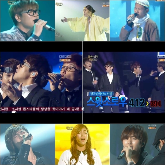 그들의 무대를 본 송대관은 “피날레에 어울리는 무대였다”면서 상기된 마음을 고스란히 드러냈다. 스윗소로우는 412점으로 정동하의 4연승을 저지하고 최종우승을 거머쥐었다.