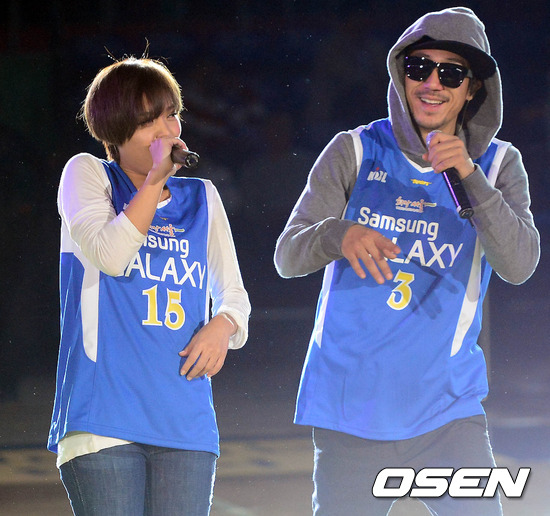 14일 오후 서울 잠실 실내체육관에서 열린 '2012-2013 KB국민카드 프로농구' 서울 삼성과 창원 LG의 경기 하프타임 타이거JK 와 윤미래가 공연을 펼치고 있다.
