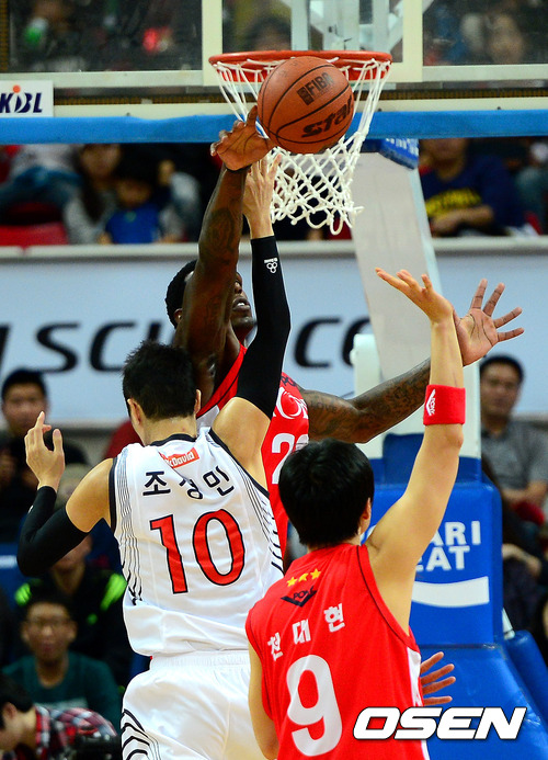 1쿼터 모비스 맥카스킬이 조성민의 슛을 슛블록 하고 있다.