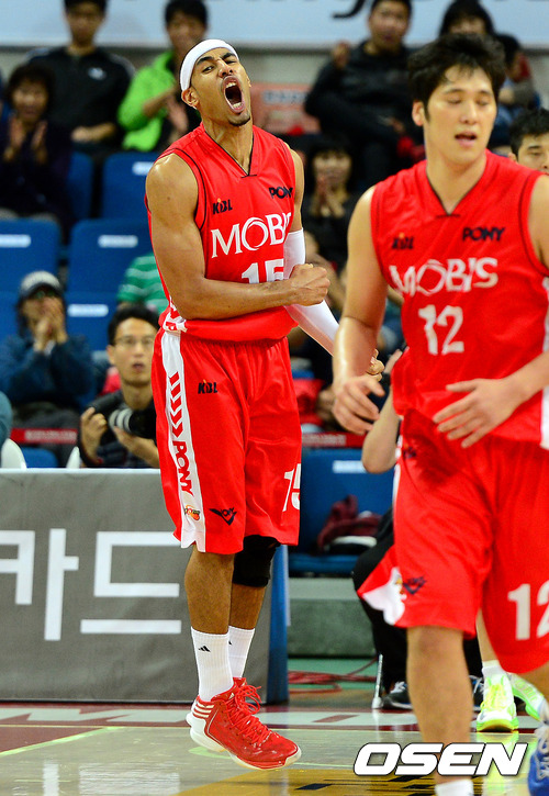 3쿼터 모비스 문태영이 슛을 성공 시키고 환호하고 있다.