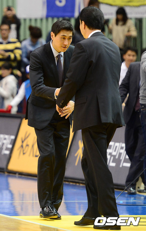 14일 오후 서울 잠실 실내체육관에서 열린 '2012-2013 KB국민카드 프로농구' 서울 삼성과 창원 LG의 경기 종료 후 이상민 코치가 LG 김진 감독과 악수를 나누고 있다.