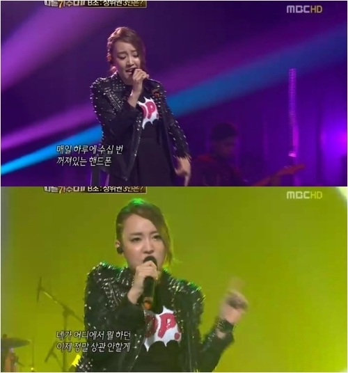 윤하는 14일 방송된 MBC 예능 프로그램 ‘일밤-나는 가수다2’(이하 ‘나가수2’)에서 2NE1의 ‘아이 돈 케어(I don’t care)’를 록 스타일로 편곡했다.