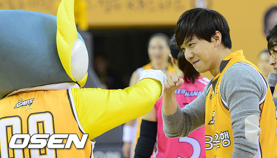14일 오후 청주 실내체육관에서 열린 'KDB금융그룹 2012-2013 여자프로농구' KB스타즈와 하나외환의 경기전 시투를 마친 이승기가 KB 마스코트와 인사를 나누고 있다.