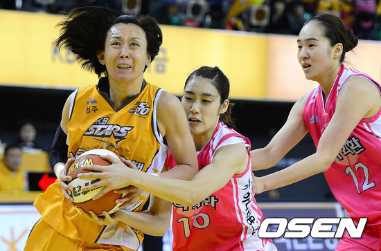 14일 오후 청주 실내체육관에서 열린 'KDB금융그룹 2012-2013 여자프로농구' KB스타즈와 하나외환의 경기, 3세트 KB 변연하가 하나외환 박하나의 수비를 피해 골밑 돌파를 시도하고 있다.