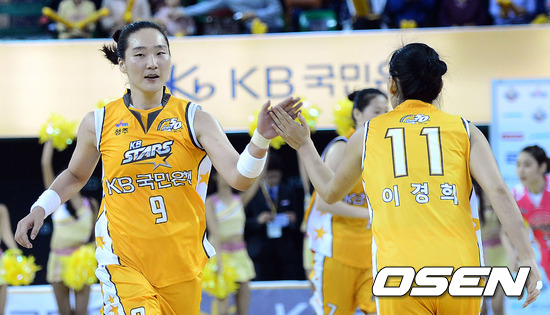 14일 오후 청주 실내체육관에서 열린 'KDB금융그룹 2012-2013 여자프로농구' KB스타즈와 하나외환의 경기, 2세트 KB 정미란이 득점을 올린뒤 이경희와 하이파이브를 하고 있다.