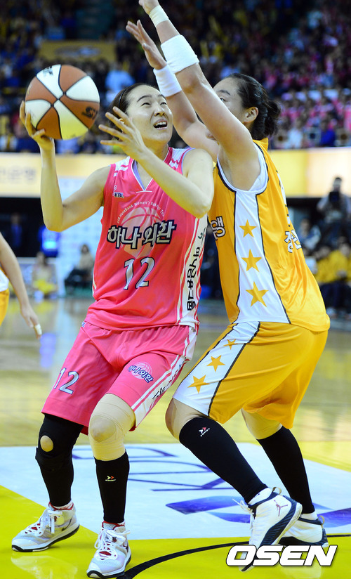 14일 오후 청주 실내체육관에서 열린 'KDB금융그룹 2012-2013 여자프로농구' KB스타즈와 하나외환의 경기, 2세트 하나외환 김정은이 골밑 슛을 시도하고 있다.