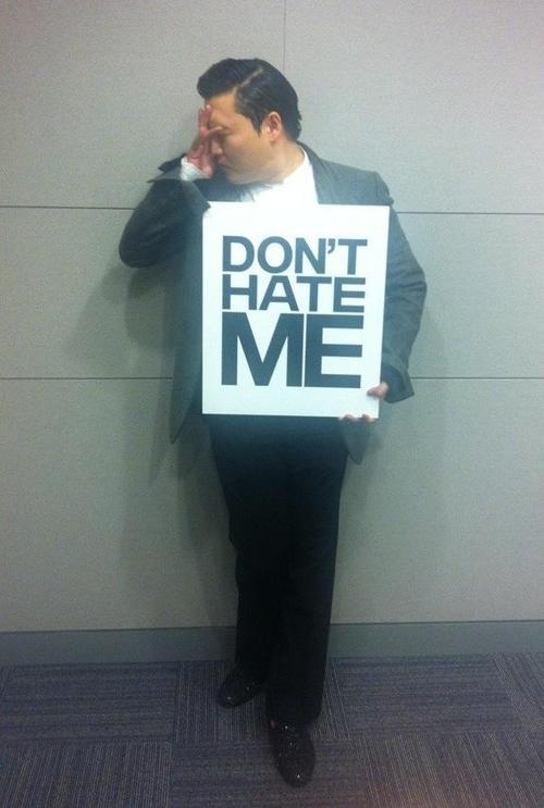 사진 속 싸이는 벽에 기대 무언가를 고뇌하는 포즈를 취하고 있다. 또 손에는 "돈 해이트 미(나를 미워하지 마라)"라는 팻말을 들고 있어 눈길을 끈다.