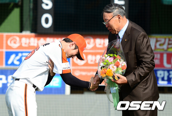 한화 주장 한상훈이 김응룡 감독에게 꽃다발을 전달하고 있다.