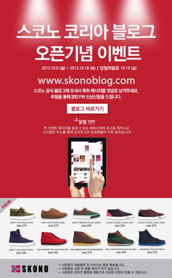 이번 행사는 이벤트의 내용을 공식 블로그나 페이스북에 포스팅 한 후 블로그에 오픈 축하 메시지를 댓글로 남기면 추첨을 통해 2012 F/W 신상 운동화를 10명에게 증정한다.