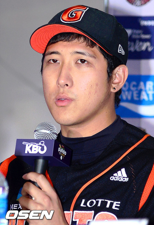 15일 오후 인천 문학구장에서 진행된 '2012 팔도프로야구 플레이오프 미디어데이'에서 롯데 황재균이 출사표를 던지고 있다.