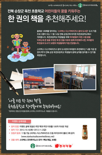스타벅스커피 컴퍼니가 2008년부터 매년 진행해온 ‘스타벅스 디스커버리즈 꿈의 도서관’이 다섯 번째 수혜학교 학생들을 위한 온라인 응원 이벤트를 실시한다.