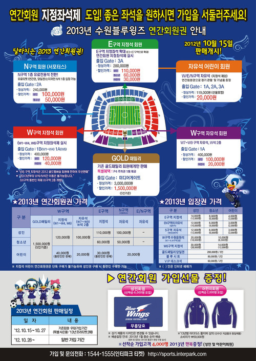지난 15일부터 인터파크를 통해 2013시즌 연간회원권 판매를 시작한 수원은 하루 동안 총 1601명이 연간회원을 구매해 1억7534만원의 판매고를 기록했다고 16일 밝혔다.