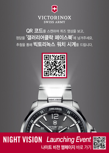 이번 이벤트는 12일부터 3주간 진행되며 갤러리어클락 매장에 설치된 QR 코드, 또는 페이스북에 게시된 나이트 비전 론칭 동영상속에 숨겨진 퀴즈의 정답을 맞히면 추첨을 통해 빅토리녹스 나이트 비전 외 2종을 증정하는 행사이다.