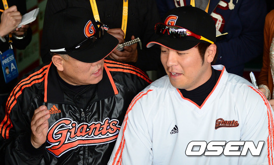 16일 오후 인천 문학구장에서 열린 2012 팔도 프로야구 플레이오프 1차전 SK 와이번스와 롯데 자이언츠의 경기, 경기에 앞서 롯데 양승호 감독이 더그아웃에서 강민호와 이야기를 나누고 있다.