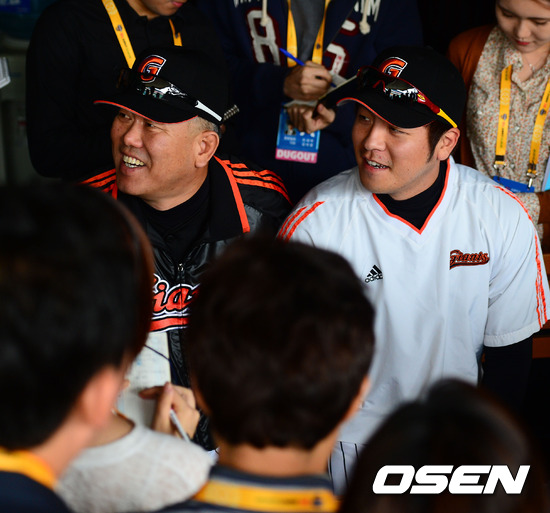 16일 오후 인천 문학구장에서 열린 2012 팔도 프로야구 플레이오프 1차전 SK 와이번스와 롯데 자이언츠의 경기, 경기에 앞서 롯데 양승호 감독이 기자들과 인터뷰 중 강민호와 어깨동무를 하며 즐겁게 얘기를 나누고 있다.