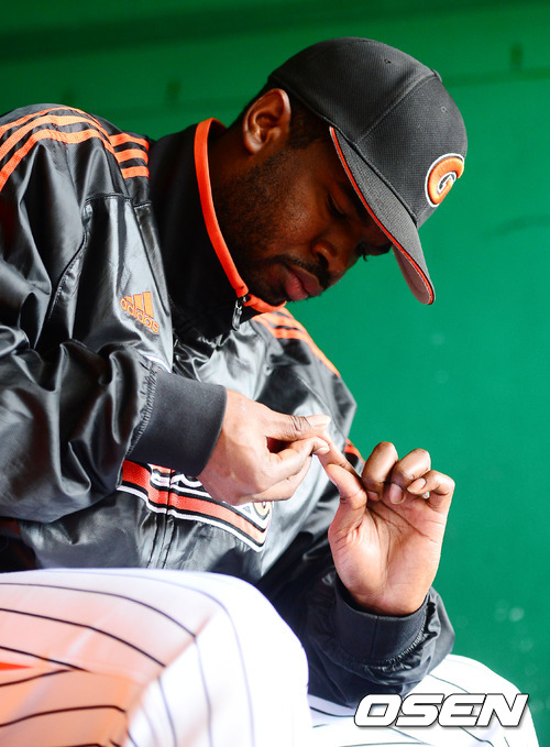 16일 오후 인천 문학구장에서 열린 2012 팔도 프로야구 플레이오프 1차전 SK 와이번스와 롯데 자이언츠의 경기, 경기에 앞서 롯데 선발투수 유먼이 손톱에 매니큐어를 칠한 후 손톱 손질을 하고 있다.