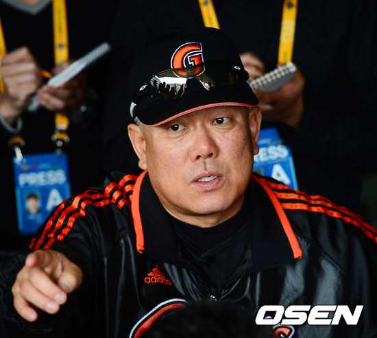 16일 오후 인천 문학구장에서 열린 2012 팔도 프로야구 플레이오프 1차전 SK 와이번스와 롯데 자이언츠의 경기, 경기에 앞서 롯데 양승호 감독이 인터뷰를 하고 있다.