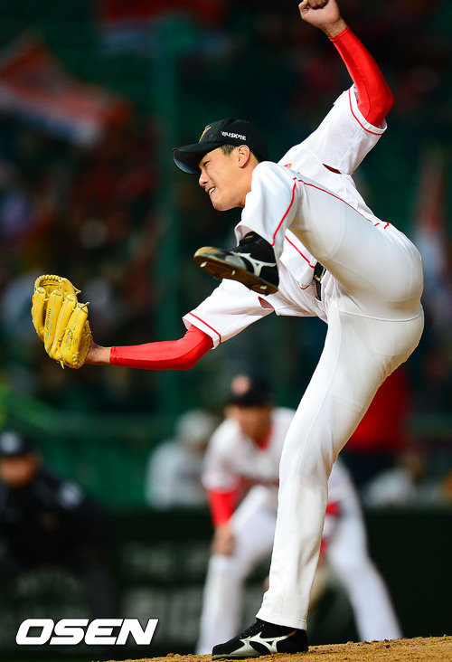 16일 오후 인천 문학구장에서 열린 2012 팔도 프로야구 플레이오프 1차전 SK 와이번스와 롯데 자이언츠의 경기에서 SK 선발 김광현이 힘차게 공을 뿌리고 있다.