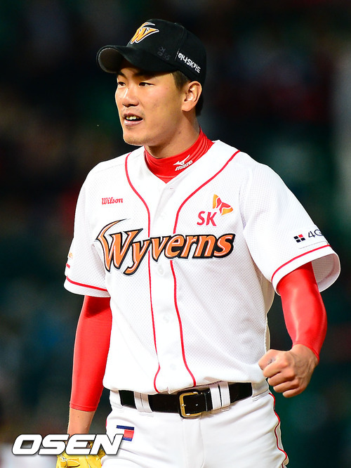 16일 오후 인천 문학구장에서 열린 2012 팔도 프로야구 플레이오프 1차전 SK 와이번스와 롯데 자이언츠의 경기에서 1회초를 마친 김광현이 주먹을 불끈 쥐며 기뻐하고 있다.