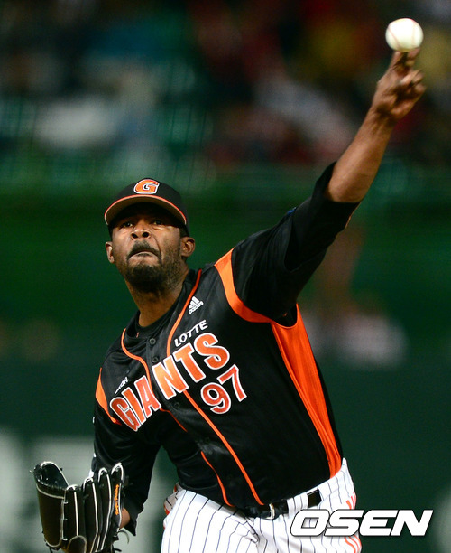 16일 오후 인천 문학구장에서 열린 2012 팔도 프로야구 플레이오프 1차전 SK 와이번스와 롯데 자이언츠의 경기, 1회말 롯데 선발투수 유먼이 힘차게 공을 던지고 있다.