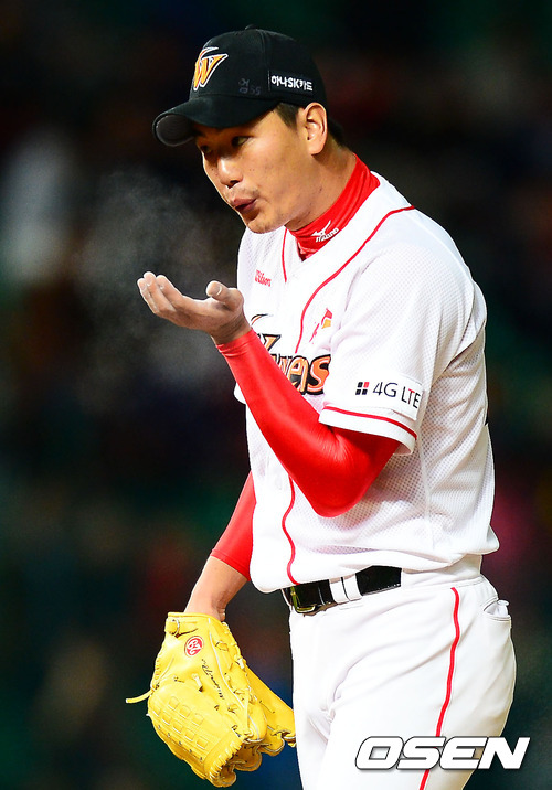 16일 오후 인천 문학구장에서 열린 2012 팔도 프로야구 플레이오프 1차전 SK 와이번스와 롯데 자이언츠의 경기에서 SK 선발 김광현이 로진가루를 불고 있다.