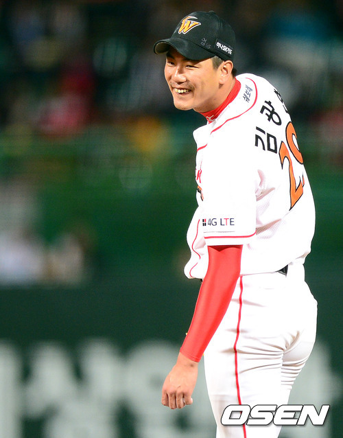 16일 오후 인천 문학구장에서 열린 2012 팔도 프로야구 플레이오프 1차전 SK 와이번스와 롯데 자이언츠의 경기, 2회초 1사 SK 김광현이 롯데 전준우를 삼진으로 처리하고 미소를 짓고 있다.