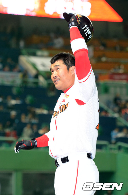 16일 오후 인천 문학구장에서 열린 2012 팔도 프로야구 플레이오프 1차전 SK 와이번스와 롯데 자이언츠의 경기 2회말 선두타자 SK 이호준이 좌월 선취 솔로홈런을 날린 후 덕아웃에서 팬들에게 인사를 하고 있다.