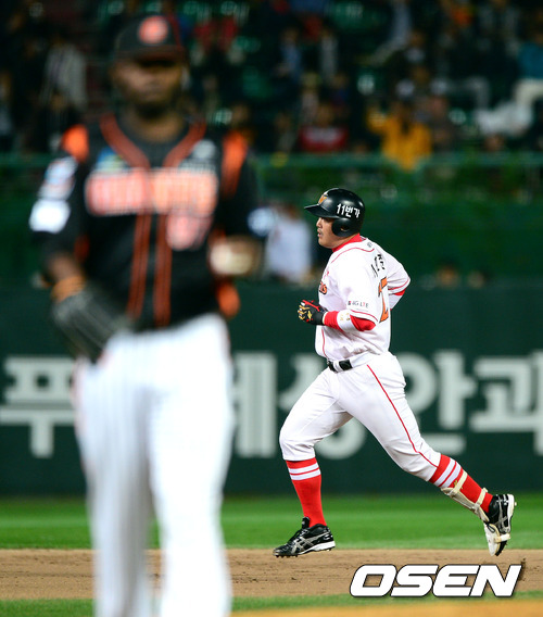 16일 오후 인천 문학구장에서 열린 2012 팔도 프로야구 플레이오프 1차전 SK 와이번스와 롯데 자이언츠의 경기, 2회말 무사 SK 이호준이 좌월 선제 솔로포를 치고 그라운드를 돌고 있다.
