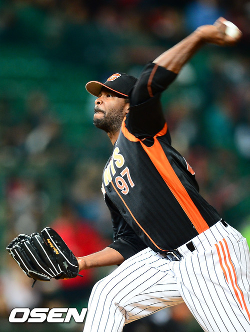 16일 오후 인천 문학구장에서 열린 2012 팔도 프로야구 플레이오프 1차전 SK 와이번스와 롯데 자이언츠의 경기에서 롯데 선발 유먼이 힘차게 공을 뿌리고 있다.