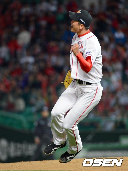 16일 오후 인천 문학구장에서 열린 2012 팔도 프로야구 플레이오프 1차전 SK 와이번스와 롯데 자이언츠의 경기, 3회초 2사 1루 김광현이 조성환을 삼진으로 처리하고 환호하고 있다.
