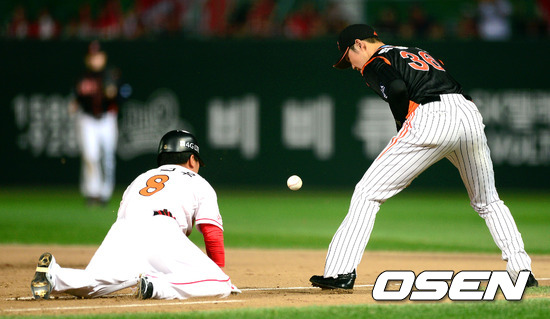 16일 오후 인천 문학구장에서 열린 2012 팔도 프로야구 플레이오프 1차전 SK 와이번스와 롯데 자이언츠의 경기, 3회말 2사 SK 정근우의 내야안타때 롯데 박종윤이 송구를 놓치고 있다.