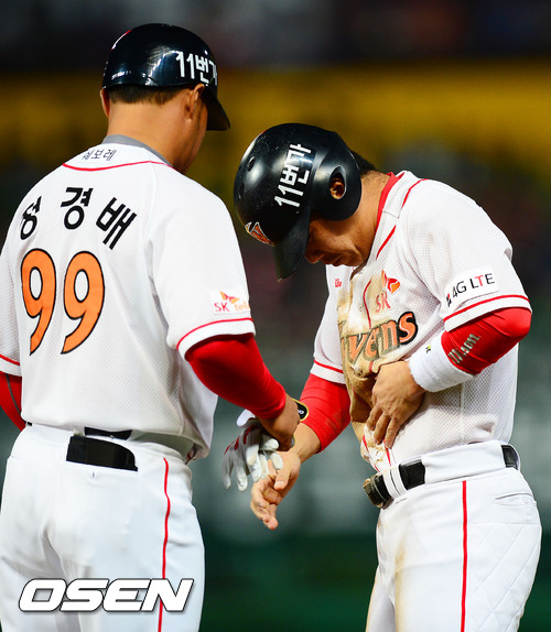 16일 오후 인천 문학구장에서 열린 2012 팔도 프로야구 플레이오프 1차전 SK 와이번스와 롯데 자이언츠의 경기 3회말 2사 주자 없는 상황에서 SK 정근우가 유격수 왼쪽 내야안타때 몸을 날려 1루에 세이프 한 후 흙을 털고 있다.